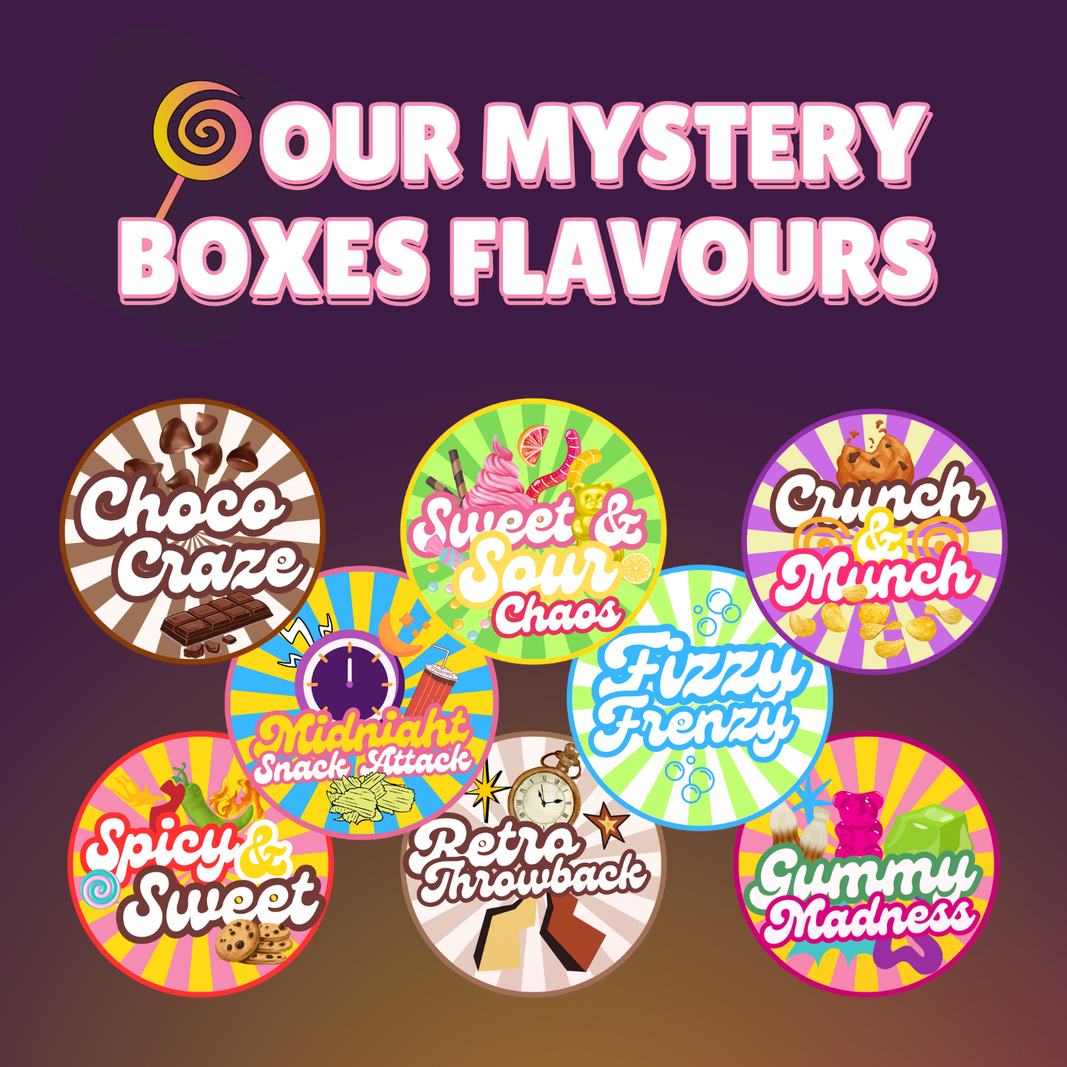 A flavorful collection of ten unique boxes, each bursting with its own delicious taste—spicy, sweet, nutty, citrusy, and more.